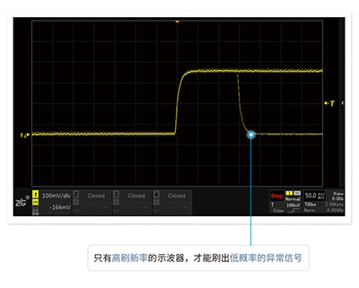 波形刷新率越高,死區時間就越短。ZDS4000系列示波器,標配1M次波形刷新率,配合模板觸發,讓您最大概率的發現并捕獲異常信號。