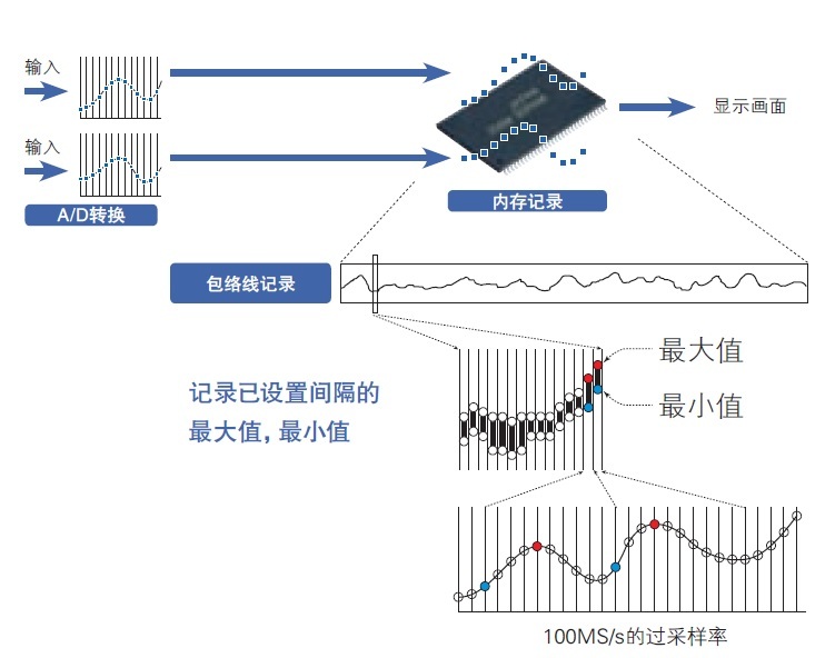通過包絡線的測量方法,進行100MS/s的過采樣同時,能夠記錄設置間隔的max值和min值。