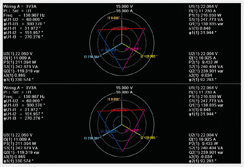 PA5000H功率分析儀可同時測量并顯示變頻器輸入三相與輸出三相的矢量圖,可對輸入、輸出各相間的相角關系進行分析,準確評估出輸入信號對輸出信號的角差影響。(所有型號均能滿足)